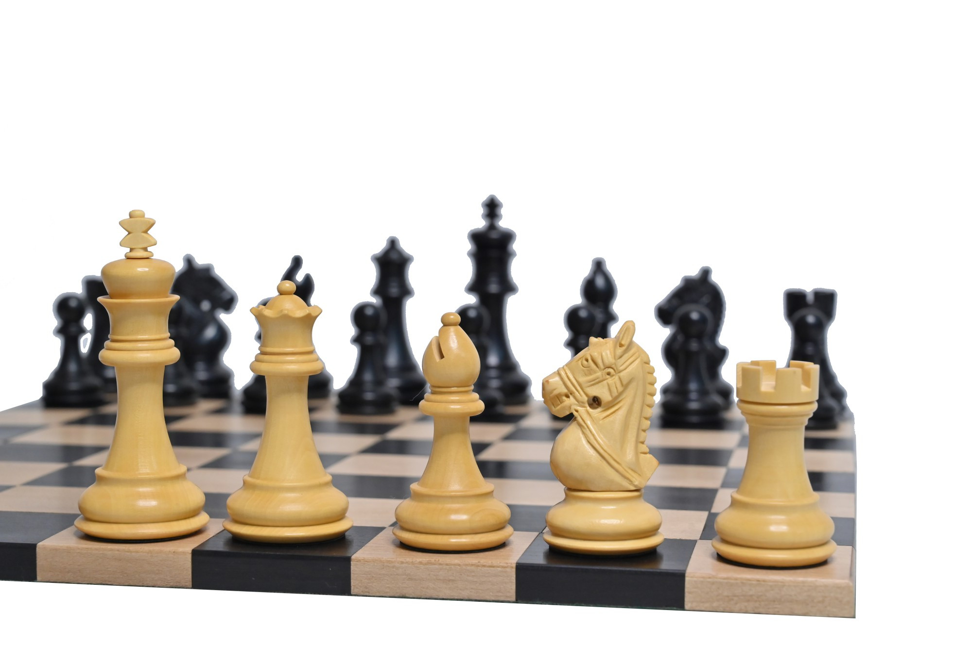 Combo Chess Set -The Bridle King Staunton Series Chess Pieces In Ebonized Boxwood with Borderless Rollup Chess Board | Taj Chess Store